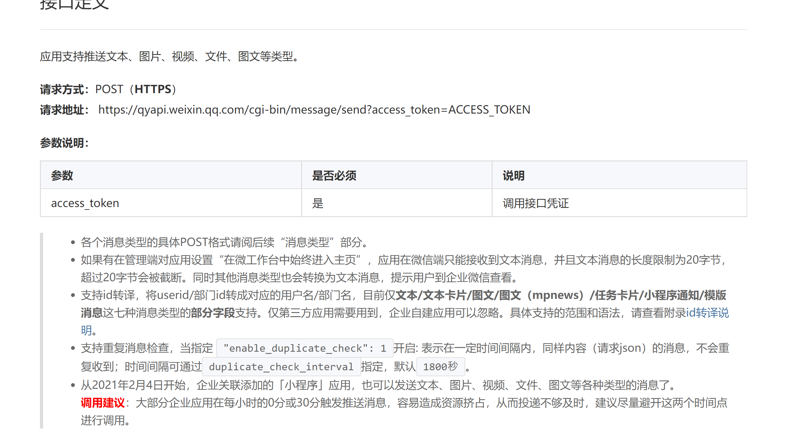 首先去访问企业微信官网api的信息推送api介绍.主要动作有两个部分获取token以及调用api推送消息